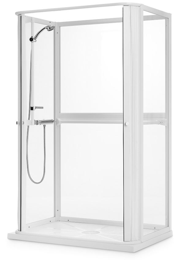 Valet av kraftigt säkerhetsglas har förutom en tilltalande design gett en överlägsen stabilitet. Det medför också att nya lösningar har kunnat utvecklas som den helt unika draperidörren. Längs både bak- och sidovägg löper stödhandtag som ger ökad trygghet och stöd för den som duschar. Även själva duschstången fungerar som extra stödhandtag vilket förenklar vid insteget i kabinen och kanske ännu mer då man kliver ut. Säkerhetsglaset skyddar också väl vid ett eventuellt fall.